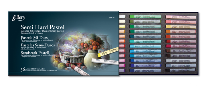 Сухі пастелі підвищеної твердості розміром 8x8x82 мм у розкішній версії з паперовими обгортками, що містять коди та позначення кольорів.