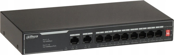 SF1010LP 10-портовий комутатор Fast Ethernet з 8 портами PoE > Підтримує вісім портів живлення 10/100M PoE та два порти висхідного каналу 10/100M > Підтримує стандарти 802.3af та 802.3at > Робоча температура: від -10°C до +55°C > Підтримує відстань передачі PoE до 250 м > Підтримує функцію сторожового пристрою PoE