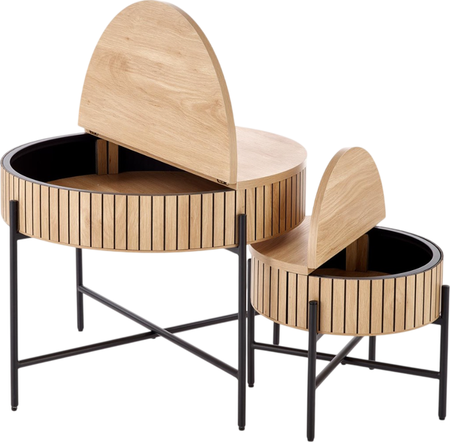 Набір з двох сучасних журнальних столиків у натуральному та чорному кольорах – це стильне та функціональне рішення для вітальні в стилі лофт або модерн. Круглі стільниці в натуральному кольорі ефектно контрастують з чорною металевою основою, створюючи елегантну та позачасову композицію.