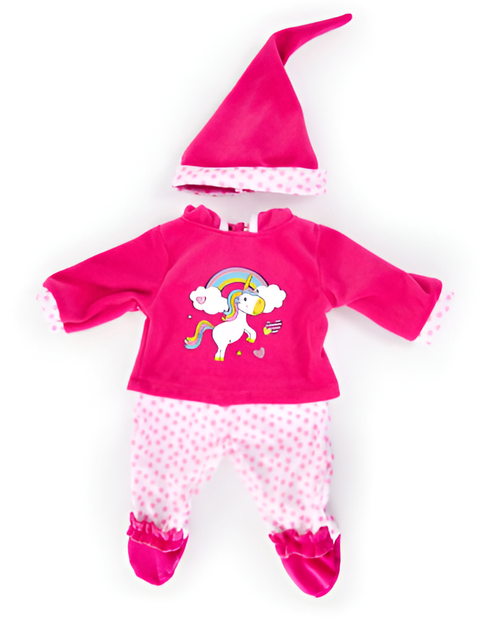 Це комплект з чотирьох частин одягу для ляльок висотою від 42 до 46 см, розроблений компанією Bayer Design. Комплект виготовлений з великою увагою до деталей і виконаний у веселій, привабливій кольоровій гамі з мотивом єдинорога. До комплекту входять комбінезон (Latzhose), верхня частина одягу, шапка і сукня, що дає різні можливості для стилізації ляльок під час гри. Елементи гардеробу мають практичні застібки на липучках, що полегшує їх одягання та знімання навіть маленьким дітям, а також сприяє розвитку ручної спритності під час гри. Продукт дозволяє надати ляльці індивідуальний вигляд і заохочує до творчої гри в різних сценаріях.