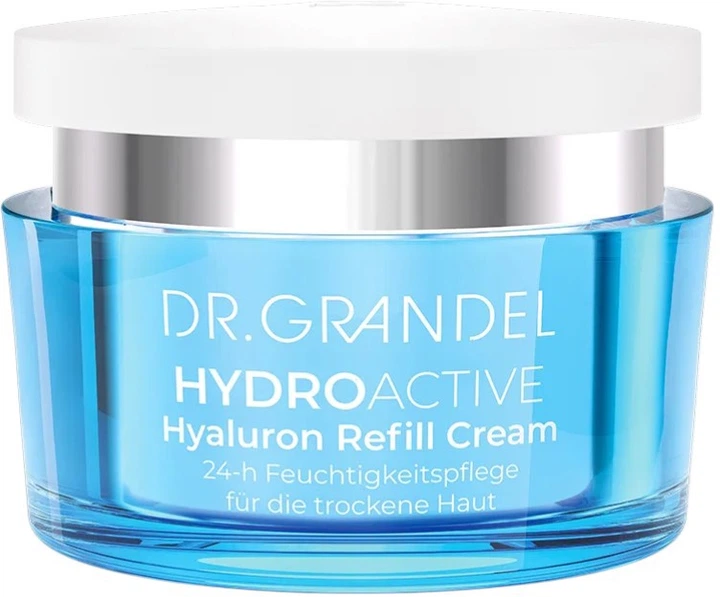 Dr. Grandel Hydro Active Hyaluron Refill Cream завдяки своїй багатій консистенції ідеально підходить для сухої шкіри. Ніжна формула швидко вбирається, роблячи шкіру м'якою та еластичною. Поєднання Filler Hyaluron і морського альгового комплексу інтенсивно зволожує, заповнює зморшки, викликані сухістю, і захищає шкіру від подальшої втрати вологи. Для гладкої шкіри, яка виглядає пружною.
