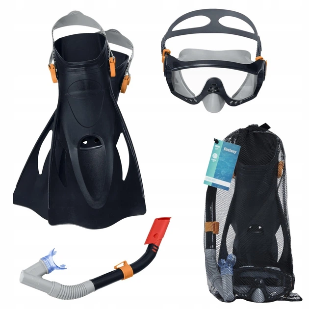 Це комплект для підводного плавання, який включає маску, трубку для дихання (сноркель) і пару ласт у універсальному розмірі 41–46 EU. Маска має регульований силіконовий ремінець, добре прилягає до обличчя і забезпечує комфорт під час занурення, а широке поле зору дозволяє краще бачити під водою. Трубка обладнана м’яким мундштуком і захистом від попадання бризок, що робить дихання під час плавання зручнішим. Ласти допомагають ефективніше просуватися у воді. Завдяки легкій конструкції цей набір зручно брати з собою на відпочинок біля моря, озера або в басейн. Комплект рекомендується для людей віком від 14 років.