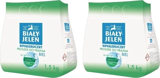 Пральний порошок Biały Jeleń Гіпоалергенний Biel 1.5 кг призначений для прання в автоматичних і напівавтоматичних пральних машинах, а також для ручного прання білизни та виробів з білих тканин. Рекомендовано для людей із захворюваннями шкіри (алергією). Не містить барвників та має зменшену ароматичну композицію. Завдяки натуральному милу та активним компонентам нового покоління видаляє забруднення вже при температурі 30°C, залишаючи свіжий, ніжний аромат. Порошок Biały Jeleń не містить фосфатів і тому є екологічно чистим.