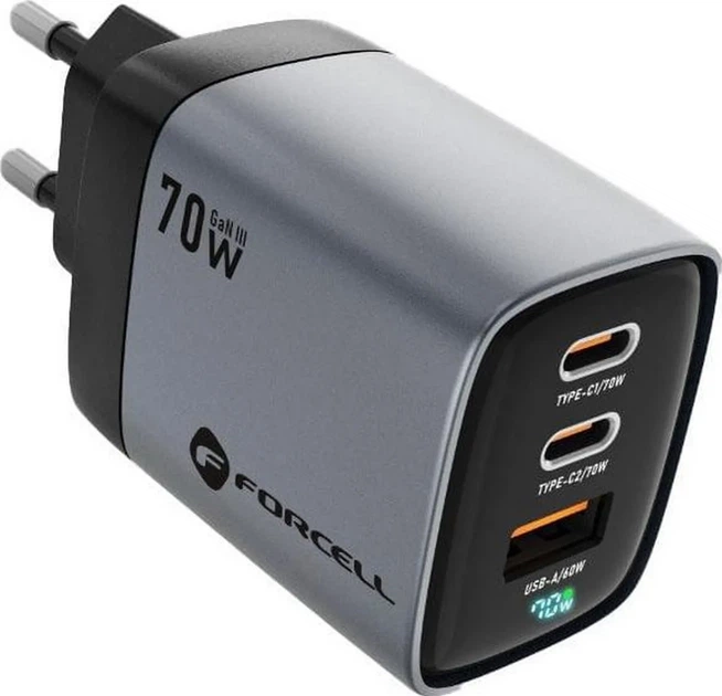 Ładowarka sieciowa do smartfonów, tabletów i laptopów, wykonana w innowacyjnej technologii GaN III. Jest kompaktowa i energooszczędna, a dzięki trzem portom pozwala ładować do trzech urządzeń jednocześnie. Ładowarka obsługuje standardy ładowania Quick Charge 4.0, Power Delivery i Super Fast Charging 2.0. Łączna moc wynosi 70 W.