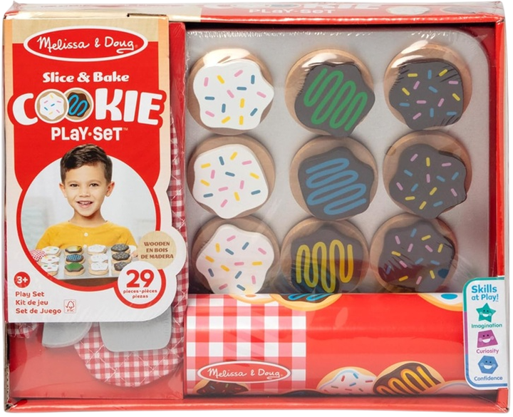 Дерев’яний набір Melissa & Doug для гри в нарізання та випікання печива — це солодкий початок кулінарних пригод! Цей яскравий комплект містить 12 дерев’яних печив, які можна розділяти на частини, 12 декоративних топінгів, дерев’яний ніж, лопатку, деко для випікання та кухонну рукавицю для безпечної й творчої гри.