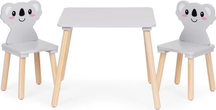 Дитячий комплект меблів ECOTOYS складається зі столу та двох стільців з унікальними спинками у формі коали. Він ідеально підходить для гри, навчання та відпочинку як вдома, так і в дошкільних ігрових зонах. Завдяки використанню міцної деревини та МДФ, весь комплект є стійким та довговічним. Стіл має широку стільницю, яка забезпечує багато місця для малювання, складання кубиків та інших творчих ігор. Закруглені краї підвищують безпеку, захищаючи дитину від випадкових ударів. Висота меблів відрегульована відповідно до зросту найменших дітей, що позитивно впливає на комфорт та підтримку правильної постави. Комплект включає два зручних ергономічних стільці зі спинками, що нагадують силует коали.
