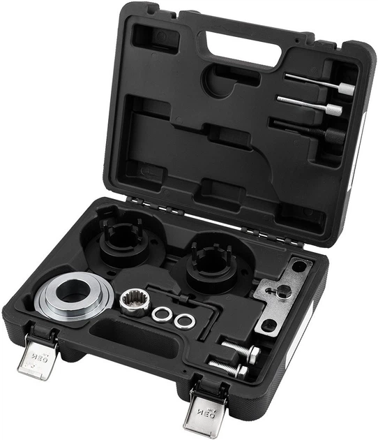 Набір NEO TOOLS підтримує коди двигунів 1.0: B7DA, B7DC, B7JA, B7JB, B7JC, M0JA, M0JB, M0DC і відповідає номерам OE: 303-1661/1, 303-1661/2, 303-1661/3, 303-1603, 303-1643, 310-018, 303-1604, 0132-AB, 23-019. Весь комплект поставляється в пластиковому кейсі.