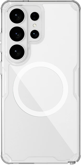 Чохол Nillkin Nature TPU Pro пропонує елегантний та міцний захист для Samsung Galaxy S26 Ultra, розроблений для щоденного використання та сумісний з аксесуарами MagSafe. Його конструкція з двох матеріалів — гнучкого TPU та жорсткого ПК — ефективно захищає задню частину та краї телефону від подряпин та тріщин. Посилені кути з повітряними подушками підвищують стійкість до падінь, а напівпрозоре біле покриття підкреслює унікальний дизайн смартфона. Це практичне рішення для тих, хто цінує захист, естетику та комфорт.