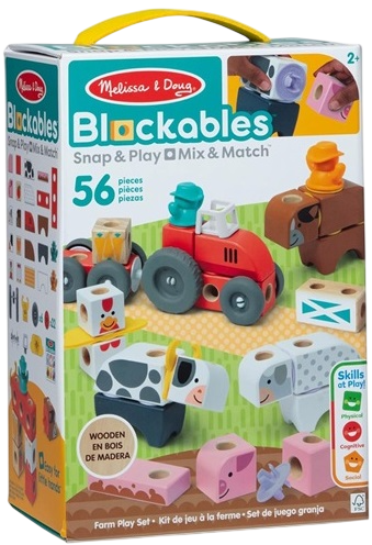 Виріб виготовлений із масивної деревини та призначений для дітей від 2 років. У наборі є дерев’яні блоки, фігурки, численні з’єднання, фетрові елементи, колеса та аксесуари, що дозволяють побудувати, зокрема, трактор із причепом і фермерських тварин, а також ілюстрована інструкція. Після розкладання упаковка може використовуватися як ігровий простір, а всі елементи зручно зберігаються у міцній коробці з ручкою. Іграшка сумісна з іншими продуктами серії Blockables від бренду Melissa & Doug і чудово підійде як подарунок або для щоденної гри без використання екранів.