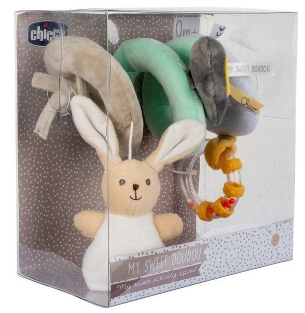 Підвіска для коляски MY SWEET DOUDOU SPIRAL – це неймовірно м’яка оксамитова підвіска для коляски з 3 іграшками: брязкальцем з різнокольоровими кульками, хмаринкою з дзеркальцем та зайчиком, які зроблять кожну поїздку вашої дитини приємнішою.