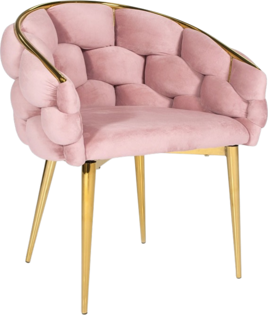 Цей рожевий велюровий стілець у стилі гламур одразу додає інтер'єру легкості, елегантності та модного характеру. Оксамитова оббивка з ніжним блиском красиво відбиває світло, завдяки чому весь стілець виглядає надзвичайно «преміальним» і затишним одночасно. Форма крісла забезпечує стабільність і зручність сидіння, а спинка приємно «обгортає» спину, створюючи відчуття комфорту, як у кріслі. Золоті ніжки з хромованої сталі підкреслюють стиль гламур і чудово контрастують з рожевим кольором, створюючи ефект «вау». Це ідеальний вибір, якщо ви хочете одним меблем змінити інтер'єр і додати йому характеру.
