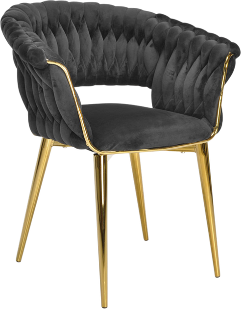 Хочете додати інтер'єру ефекту «преміум» без ремонту? Це крісло в глибокому чорному кольорі з оксамитовим велюром і золотою основою миттєво підкреслює атмосферу приміщення. Плетена спинка надає йому декоративного характеру, завдяки чому воно виглядає як з елегантного шоуруму. М'яке сидіння і досконала форма роблять його комфортним і привабливим. Це пропозиція для людей, які люблять виразні аксесуари, але також очікують комфорту на щодень.