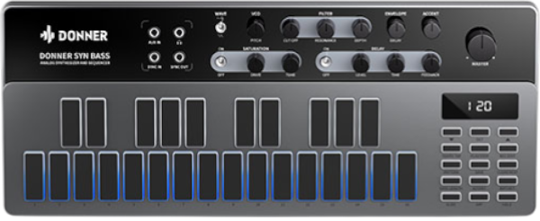Аналоговий синтезатор Donner B1 — це компактний монофонічний інструмент, створений для експериментів із класичним аналоговим звучанням у сучасному форматі. Він оснащений одним осцилятором та низькочастотним фільтром (VCF), що дозволяє формувати характерні басові лінії та кислотні лід‑партії. Панель керування містить набір ручок для точного налаштування звучання — Saturation, Drive, Tone, Delay, Level, Time, Feedback, а також кнопки для роботи з секвенсером: вибір патернів, транспонування, темп, запис і очищення. Синтезатор підтримує MIDI IN/OUT, USB‑MIDI (USB‑C), має лінійний вихід 1/4″ TRS, вихід для навушників 3.5 мм та входи AUX IN і Sync IN, що робить його сумісним із сучасними DAW та іншими апаратними пристроями. Завдяки компактним розмірам 32.5 × 12 × 5.6 см і вазі лише 0.62 кг, Donner B1 легко інтегрується в будь‑яку студію чи лайв‑сетап, пропонуючи потужне аналогове звучання у портативному корпусі.
