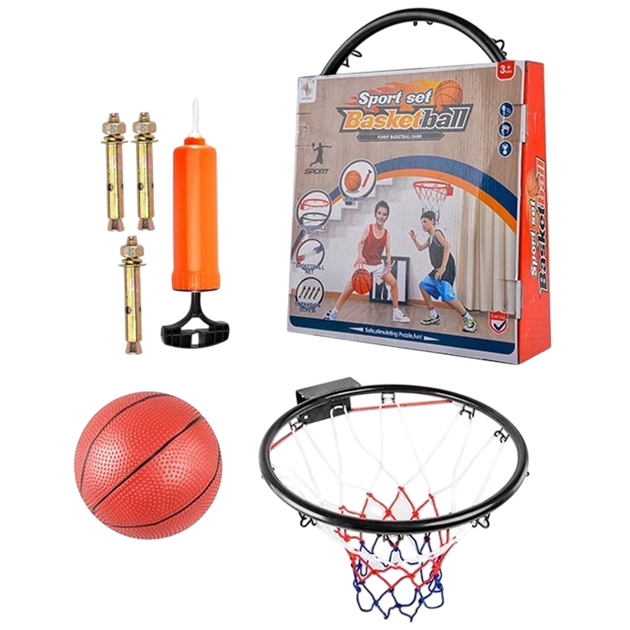 У комплекті також є баскетбольний м'яч та насос для його накачування, завдяки чому комплект готовий до використання відразу після розпакування. Додані монтажні елементи дозволяють легко прикріпити обруч до стіни або іншої стійкої поверхні.