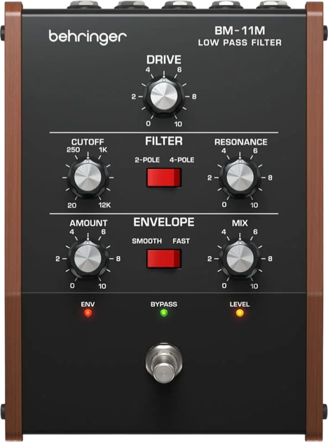 BM-11M пропонує аналоговий фільтр нижніх частот з перемиканим режимом 2- і 4-полюсним, що дозволяє отримати як тонке згладжування звуку, так і агресивні, динамічні ефекти фільтрації. Вхідний контур з регулюванням Drive дозволяє насичувати сигнал гармоніками, надаючи йому характерний, теплий звук. Функція Envelope Follower реагує на рівень вхідного сигналу, динамічно змінюючи точку відсічення фільтра. Це дозволяє отримати надзвичайно живий і виразний ефект, що залежить від стилю гри.