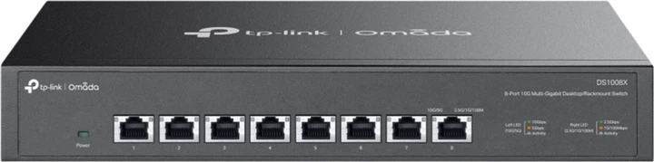 Omada DS1008X — це восьмипортовий комутатор, який забезпечує роботу з багатошвидкісними підключеннями та високою пропускною здатністю. Його головна перевага — підтримка портів від 100 мегабіт до 10 гігабіт, що дозволяє безперешкодно підключати сучасні сервери, NAS‑сховища, ігрові комп’ютери чи точки доступу Wi‑Fi 6. Завдяки автовизначенню швидкості та функції Auto MDI/MDIX процес підключення максимально простий і не потребує додаткових налаштувань.