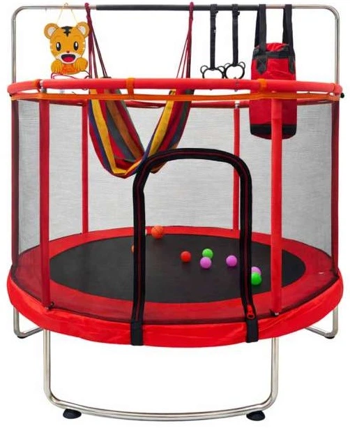 Окрім безпечної зони для стрибків, набір включає баскетбольну дошку з тигровою тематикою та м’яч з насосом, різнокольорові м’ячі для вільної гри, гамак, який висить всередині конструкції, та тренувальні ручки для підтягувань. Все це доповнюється багатофункціональною боксерською грушею з рукавичками, яку можна використовувати як для активної гри, так і для зберігання аксесуарів. Завдяки цьому, щоразу, коли ви ступаєте на батут, ви знаходите новий спосіб руху, а енергія вашої дитини знаходить свій шлях у безпечному, стабільному та захопливому середовищі.