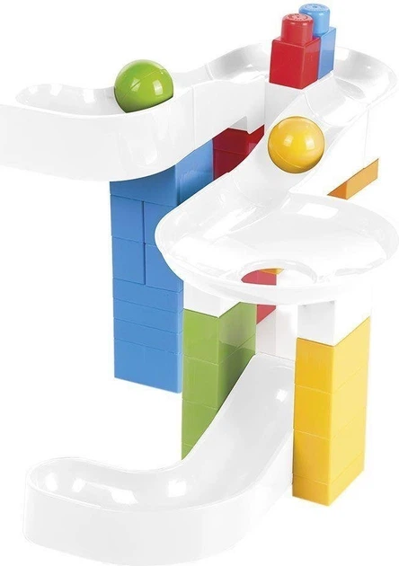 Konstruktor Dolu Ball Track to zestaw edukacyjny, który pozwala dziecku samodzielnie budować tor dla kulek. Z elementów zestawu można tworzyć różne warianty wieży lub spiralnego zjazdu, po którym poruszają się kulki.