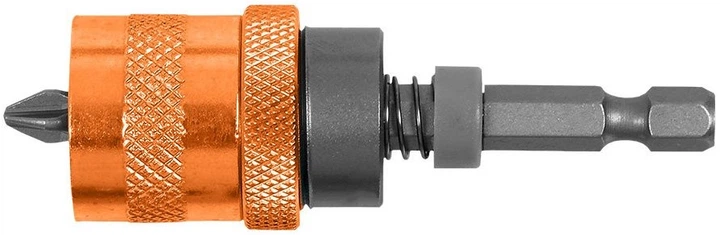 Тримач для насадок, 1/4", 65 мм, набір із 5 штук 39-340 від NEO TOOLS — це магнітний тримач, призначений для роботи з насадками для викруток такого самого профілю, а також набір із 4 бітів (2x PH2 та 2x PZ2). Конструкція тримача, що поєднує компактну довжину з магнітним кріпленням біта, полегшує точне ведення та зменшує ризик випадання насадки під час монтажу. Версія ¼” HEX забезпечує розмірну сумісність насадки та гнізда, що забезпечує надійне кріплення та повторюваність роботи. Тримач NEO TOOLS призначений для роботи з максимальною швидкістю обертання 2 500 об./хв. Завдяки спеціальному механізму можна закріпити біту на оптимальній глибині. Виконання зі сталі CrV забезпечує йому належну довговічність.