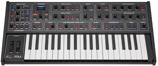 Синтезатор Fourm оснащений 37 -клавішною компактною клавіатурою з функцією поліфонічного афтертачу, що дозволяє застосовувати просунуті техніки експресії, такі як гітарне підтягування звуків, плавне наростання голосу чи інші нюанси артикуляції — повністю змінюючи враження від гри на сучасному аналоговому полісинтезаторі.