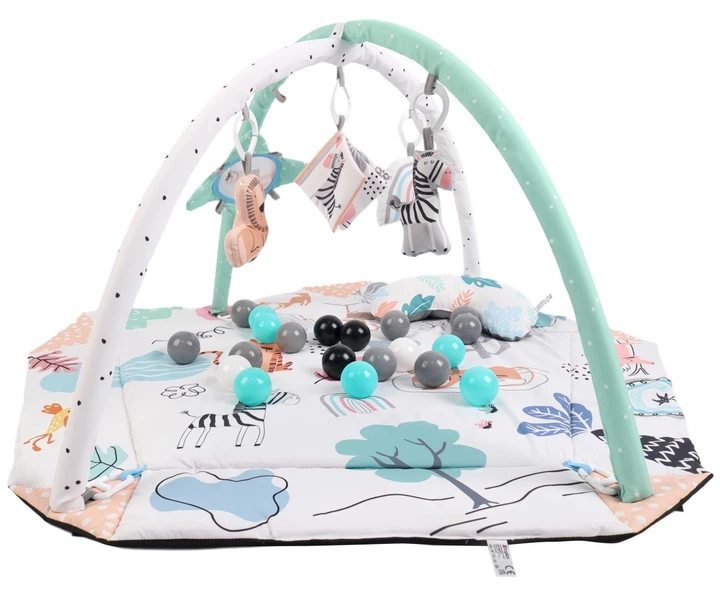 Оснащений 2 м’якими дугами, на яких розміщені різноманітні сенсорні підвіски, що сприяють розвитку дитини: