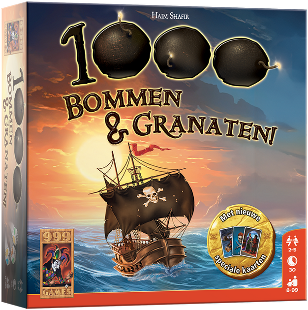 Гра в кості на піратську тематику. У грі «1000 бомб і гранат!» ви намагаєтеся викинути якомога більше однакових символів, використовуючи 8 кубиків. Ви можете кидати скільки завгодно разів, але черепи потрібно відкладати. Якщо ви викинете третій череп, ваш хід негайно закінчується, і ви не заробляєте очок. Карта пірата вказує на ваші можливості та обмеження під час ходу. Чим більше однакових символів ви викинете, тим більше очок ви заробите. Ви також отримуєте бонусні очки за золото та діаманти. Якщо всі ваші кубики набирають очки, ви отримуєте додатковий бонус. Якщо ви викинете 4 або більше черепів під час першого кидка, ви нараховуєте негативні очки іншим гравцям. Перший гравець, який набере певну кількість очок, виграє гру. «1000 бомб і гранат!» – це проста гра в кості, де вам завжди доводиться вибирати між зупинкою та продовженням. Гра для справжніх ентузіастів азартних ігор!