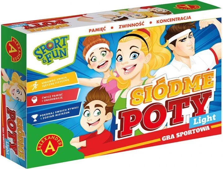 «Сім потів» – це енергійна гра, в якій гравці рухаються по дошці, збирають картки навичок і, перш за все, виконують фізичні вправи.