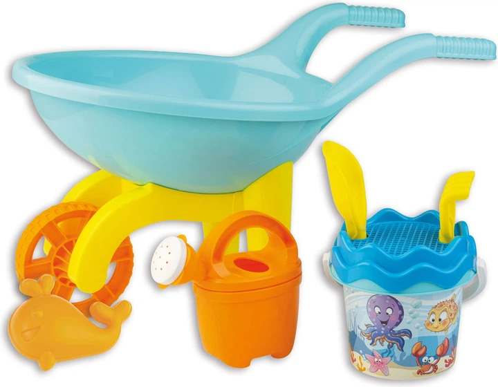 Цей розкішний набір для гри з піском та водою забезпечить вам години веселощів на пляжі! У комплект входить тачка, сито, відро, лопата, граблі, лійка та піщана форма. Безліч ігор, які розважатимуть вас годинами з невеликою кількістю піску та води! Відро також натхненне чарівним підводним світом, повним чарівних морських істот. Цей набір для гри з піском також ідеально підходить для пісочниці.