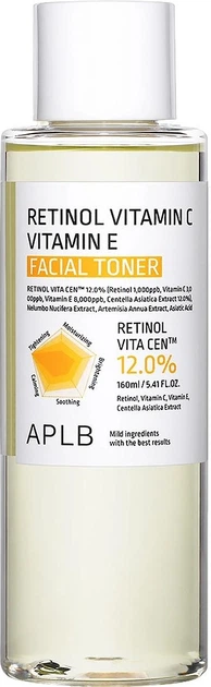 Тонік для обличчя APLB Retinol Vitamin C Vitamin E з ретинолом та вітамінами C та E містить комплекс Retinol Vita Cen (суміш ретинолу, вітаміну C, вітаміну E та екстракту центели азіатської), який бореться з ознаками старіння, освітлює та зволожує шкіру. Містить 12% екстракту центели азіатської, який заспокоює подразнення та роздратування шкіри. Легка формула легко розподіляється та швидко вбирається, не залишаючи відчуття липкості, забезпечуючи комфортне використання та видимі результати.