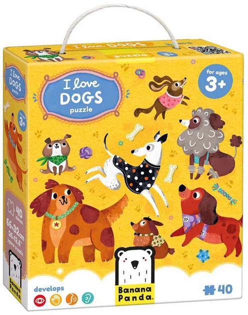 Гав-гав, цуценята, давайте гратися! 10 веселих, дружніх собак та цуценят запрошують вас у веселу пригоду, яка покращить ваші навички спостереження, дрібну моторику та уяву. Цей великий пазл складається з 40 деталей. Він ідеально підходить як складний перший пазл для початківців-головоломщиків. Обов'язковий предмет для кімнати будь-якого юного любителя собак!