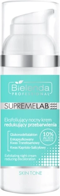 Нічний відлущувальний крем Bielenda Professional Supremelab Skin Tone, що зменшує зміну кольору шкіри, 50 мл - крем, створений для людей, які борються з різними типами зміни кольору шкіри, такими як гормональні зміни, акне, пошкодження від сонця або нерівномірний тон шкіри. Цей крем, завдяки своїй унікальній формулі, працює на кількох рівнях, зменшуючи зміну кольору шкіри та покращуючи загальний стан шкіри.