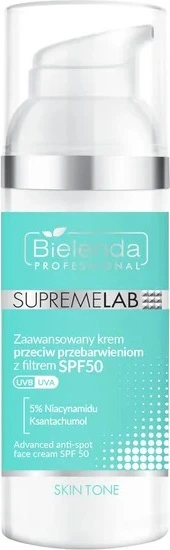 Крем для зняття плям Bielenda Professional Supremelab Skin Tone Advanced Anti-Discoloration Cream з SPF 50 UVA/UVB, 50 мл – Цей крем розроблений для щоденного догляду за шкірою зі зміною кольору шкіри. Завдяки своїй вдосконаленій формулі з 5% ніацинаміду та потужному антиоксиданту ксантогумолу, він ефективно освітлює шкіру, вирівнює тон шкіри та зменшує зміни кольору шкіри різного походження (сонячне, гормональне, акне). Високий рівень захисту SPF 50 від UVA/UVB запобігає утворенню нових пігментних плям. Легка, комфортна формула, ідеальна для щоденного використання.