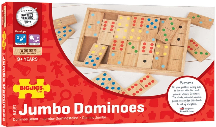 Чи зможете ви правильно вишикувати плитки в цій грі «Джамбо Доміно»? Доміно виготовлені з міцної деревини та мають розмір, що підходить для дитячої руки, що дозволяє легко їх тримати. Після гри доміно можна зберігати в дерев'яній коробці, що додається. Граючи в доміно, діти вивчають числа, причинно-наслідкові зв'язки.
