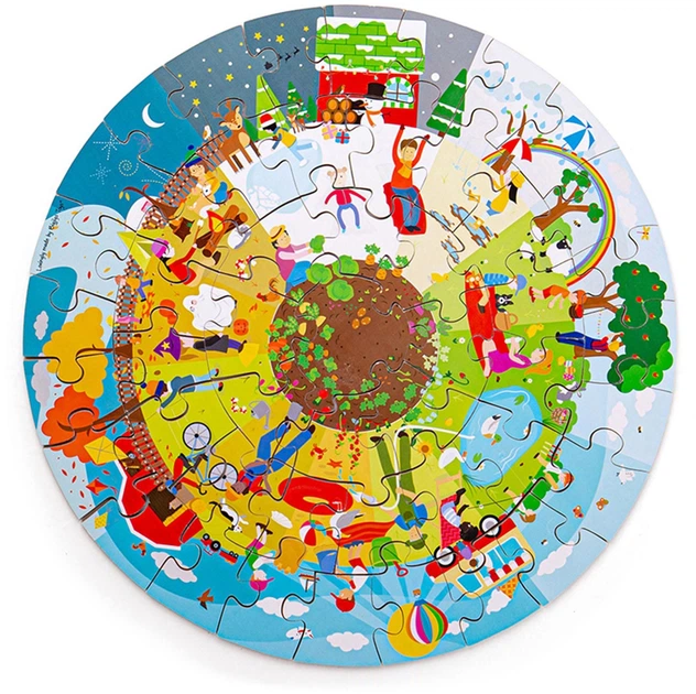 Ta wyjątkowa, okrągła, 50-elementowa układanka podłogowa została zaprojektowana specjalnie, aby nieustannie fascynować dzieci. Drewniana układanka przedstawia 360-stopniową scenę pór roku: zima, wiosna, jesień i lato mijają, a na obrazkach dzieje się mnóstwo rzeczy.