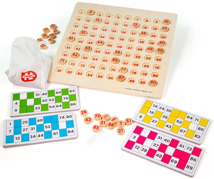 Хто не знає бінго? Ця весела гра гарантує години розваг з родиною та друзями. Ведучий гри витягує число з мішка та оголошує його. Потім це число кладеться на дерев'яну дошку. Після того, як ведучий прочитає число, гравці перевіряють свої картки з рахунками, щоб побачити, чи є у них назване число. Якщо так, вони кладуть фішку на це місце. Якщо названого числа немає на картці, гравці нічого не роблять.
