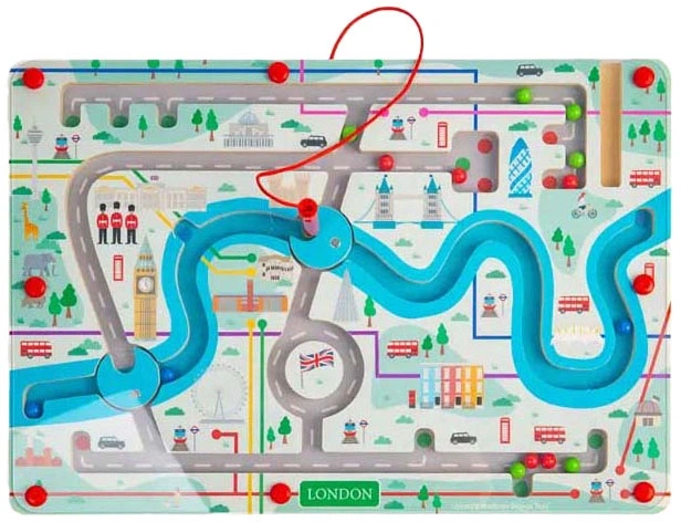Досліджуйте жваві міські вулиці з нашим лондонським лабіринтом-головоломкою! Використовуючи червоний магнітний маркер, малюки можуть провести 15 магнітними кульками лабіринтом. Пройдіть повз знакові пам'ятки, такі як Букінгемський палац, Лондонське око та Тауерський міст, або проїдьтеся вздовж річки Темзи, повертаючи магнітні спінери, щоб змінити напрямок.