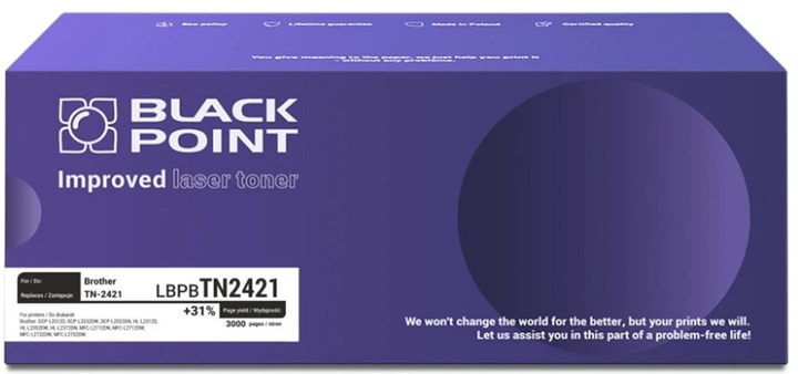 Замінник LBPBTN2421 для Brother TN-2421 пропонує такий самий зручний друк, гарантуючи високу якість. Цей тонер можна використовувати для різноманітних цілей вдома або в офісі. Витратного матеріалу вистачає на 3000 сторінок, що стільки ж, скільки й офіційного тонера Brother.