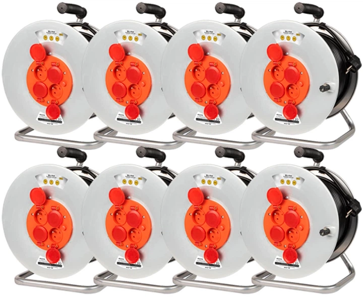 Кожен подовжувач оснащений чотирма розетками із заземленням типу E, самозакривними захисними шторками та має клас захисту IP44, що дозволяє безпечно використовувати його на відкритому повітрі, навіть за несприятливих погодних умов. Металевий барабан забезпечує підвищену міцність, зручне зберігання та транспортування кабелю, а кабель довжиною 50 метрів дає повну свободу роботи на великих площах.