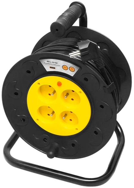 Міцний подовжувач з котушкою від Blow. Надзвичайно корисний та незамінний для підключення електричних пристроїв, таких як газонокосарка, дриль, автопилосос або садовий ліхтарик. Ключові характеристики: - 3 дроти перерізом 2.5 мм- Барабан виготовлений з високоякісних матеріалів- Ергономічна ручка з гумовою накладкою для зручного транспортування- 4 розетки із заземлюючими контактами - тип E- Міцний та довговічний Подовжувач, виготовлений з високоякісних матеріалів та товстих трижильних проводів перерізом 2.5 мм. Ідеально підходить для підключення домашніх електроприладів. Чотири зручні та продумані розетки Котушка оснащена чотирма розетками. Розетки оснащені заземлюючими контактами, виготовленими відповідно до польських стандартів – будь-який тип вилки можна підключити без проблем. Специфікація: - Модель: PR-61- Тип: на барабані- Жили: 3 x 2.5 мм- Вилка: мережева, кутова- Заземлення: так- Матеріал: ПВХ- Колір барабана: чорний/жовтий- Колір кабелю: чорний