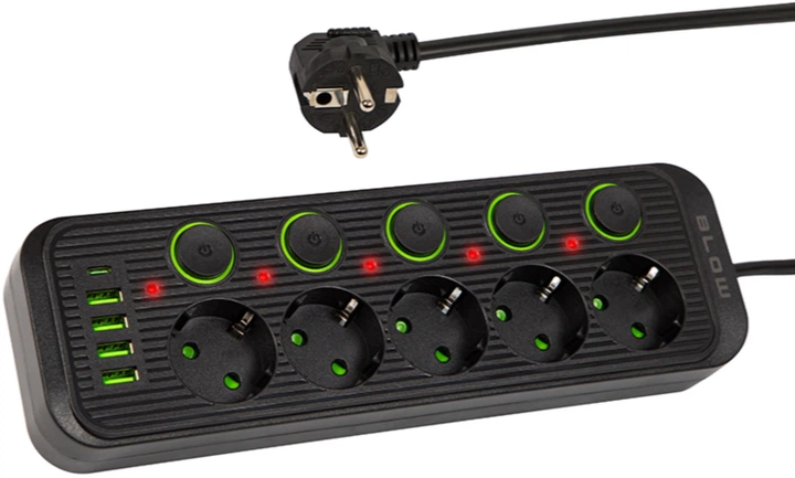 Чорний подовжувач Blow з п'ятьма розетками призначений для домашнього використання. Цей подовжувач дозволяє підключати пристрої, розташовані далеко від розетки. Виріб має п'ять кутових розеток і вимикач на одному кінці, а також одну кутову вилку на іншому. Чому варто обрати подовжувач Blow? - Швидка зарядка завдяки 4 портам USB + USB Type-C- Висока якість виготовлення та найякісніші матеріали- Перемикач, який дозволяє вмикати/вимикати смужку одним клацанням миші- Ідеально підходить для живлення побутової техніки, такої як ноутбуки, телефони, пилососи, телевізори, домашні кінотеатри та багато іншого. Специфікація: - Модель: PS-530S- Жили: 3 x 1 мм- Загальна довжина: 3 м- Довжина кабелю: 2.7 м- Вилка: мережева, кутова- Максимальний струм: 10 А, 2500 Вт- Напруга: 220-240 В- Кількість USB-портів: 4 + USB-C- Перемикач: так