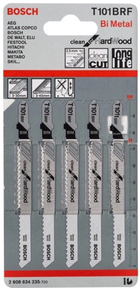 Стійке пиляльне полотно Clean for Hard Wood T 101 BRF загальною довжиною 100 мм зі шліфованими, заточеними зубами з кроком 2.5 мм виконує чистий прямолінійний пропил у твердій деревині, плитах із покриттям, ламінат завтовшки від 3 до 30 мм, стільниці завтовшки від 3 до 45 мм. Виготовлена з біметалу, пилка вирізняється довгим терміном експлуатації