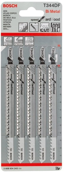 Пиляльне полотно Speed for Hard Wood T 344 DF загальною довжиною 152 мм із фрезерованими зубами розведеної форми з кроком 4 мм швидко по прямій розрізає вздовж і поперек волокон тверду та м'яку деревину, будь-які плити завтовшки від 5 до 100 мм. Високоміцна біметалева пилка розпилює навіть деревину зі цвяхами й іншими металевими предметами.
