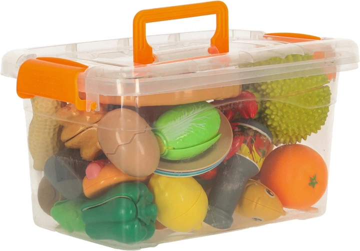 Kolorowy zestaw 36 elementów do zabawy w kuchnię, który pomaga rozwijać motorykę małą, koordynację rąk i wyobraźnię. Owoce i warzywa z rzepami można „kroić” plastikowym nożem, co sprawia, że gra jest fascynująca i edukacyjna. W zestawie znajdują się różne produkty, talerze i sztućce do pełnej zabawy. Po zakończeniu zabawy wszystkie elementy można wygodnie przechowywać w plastikowym pudełku.