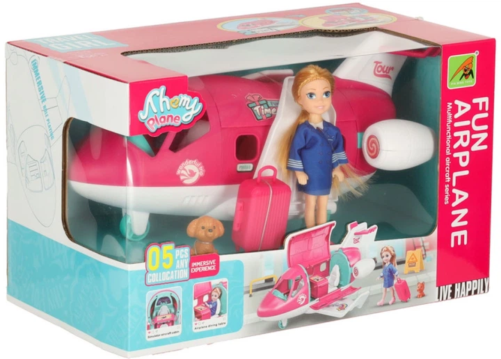 W zestawie: samolot z otwieranym kadłubem i skrzydłami, lalka stewardessa, walizka, wózek serwisowy, figurka psa, instrukcja.