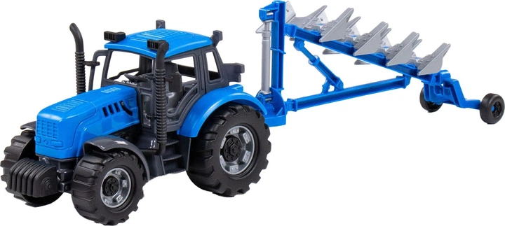 Трактор Cavallino з плугом, синій, масштаб 1:32, 1450916 (8719214073176). Ця модель є синьою версією трактора масштабу 1:32, оснащеного навісним плугом для польових робіт. Характерний колір трактора пропонує цікаву альтернативу традиційним кольорам сільськогосподарської техніки. Рухомий плуг дозволяє дітям реалістично відтворювати сцени, пов'язані з оранням поля та підготовкою ґрунту до посівів. Іграшка виготовлена з увагою до деталей, що робить її привабливою як для гри, так і для колекціонування. Цей міцний та функціональний транспортний засіб стимулює уяву та заохочує дітей дізнаватися про роботу фермера.
