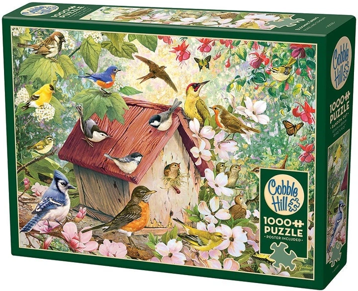 Весна настала, і птахи розкажуть вам про це все. У них є нова годівниця для птахів, щоб зібратися біля неї, в оточенні прекрасних квітучих сакур та метеликів. Здається, кожен птах у цьому районі знає про нових пташенят і прилетів, щоб привітати їх. Цей пазл із 1000 елементів містить малинівок, блакитних сойок, синіх птахів, щигликів, повзиків, кардиналів та інших птахів!
