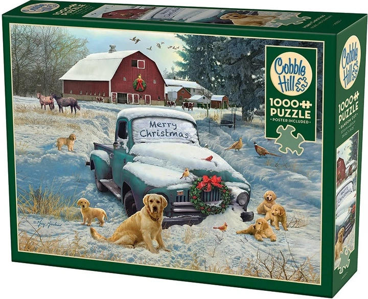 Приготуйтеся дзвеніти, складаючи цей святковий пазл із 1000 елементів! Відсвяткуйте магію пори року із затишною зимовою фермою, на якій зображена засніжена старовинна вантажівка, що гордо демонструє привітання «Веселого Різдва». Спостерігайте, як грайливі цуценята, дружелюбні коні та допитливі корови граються на засніжених полях навколо веселого червоного сараю. Це ідеальний пазл, щоб зігріти ваш святковий дух — один елемент за раз!