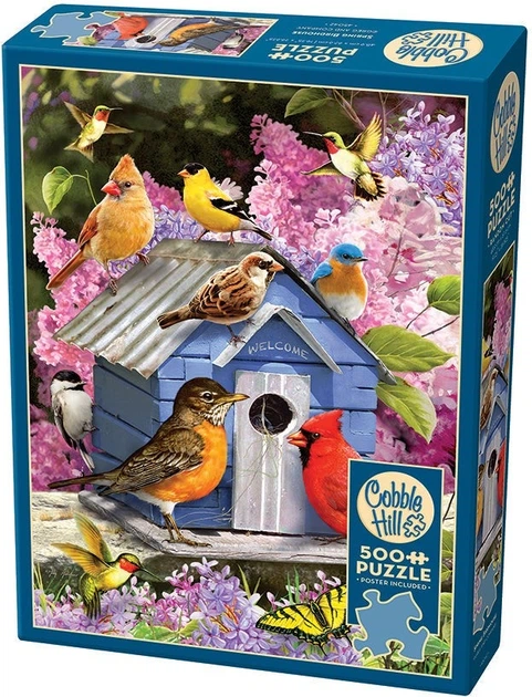 Весняна шпаківня стоїть на кам'яній стіні, а дерево виглядає так, ніби його щойно пофарбували в гарний фіолетово-блакитний колір, з бляшаним дахом, на якому можуть сісти птахи. Навколо збирається безліч птахів, зокрема малинівка, кардинал, жовтий чиж, синій птах, повзик і навіть колібрі та метелики, що ширяють у повітрі! За шпаківнею ховаються красиві бузкові та рожеві квіти. Фон у верхньому лівому куті розмитий, що може ускладнити складання, але пазл із 500 елементів має більші елементи, що означає більше деталей на кожному елементі. Пазл орієнтований портретно, і його варто розглянути тим, кому важко дотягнутися до себе через стіл.