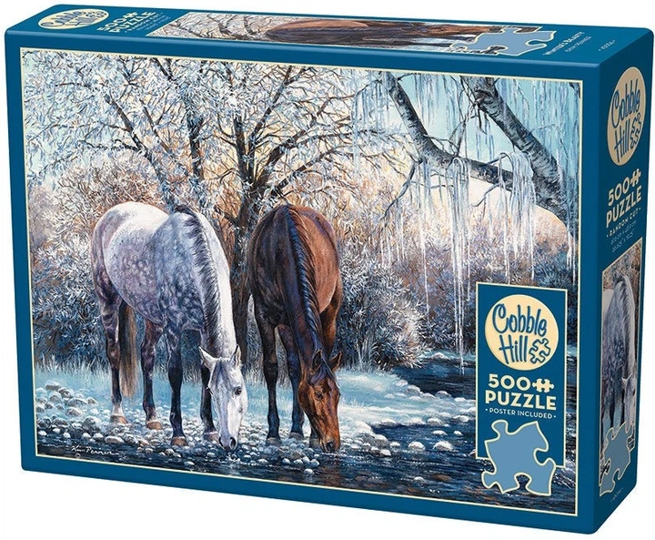 Лісові дерева вкриті інеєм, але хрустка вода все ще тече, освіжаючи прекрасних коней, які насолоджуються зимовою красою. Виклик із 500 елементів для любителів коней.