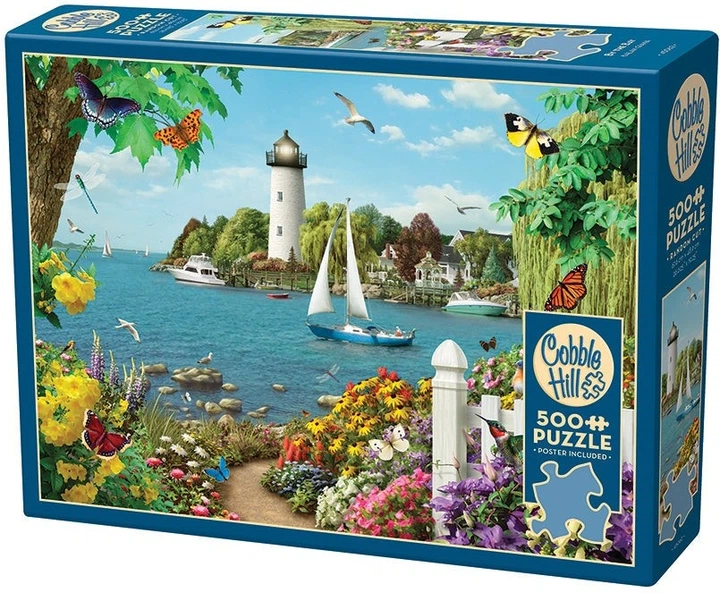 Доглядач маяка, птахи та метелики в затоці спостерігають за відпливанням вітрильника. Пазл «Коббл-Гілл» із 500 елементів складається з великих деталей нерівної форми та містить плакат із інструкціями, який допоможе вам у вашій пригоді!